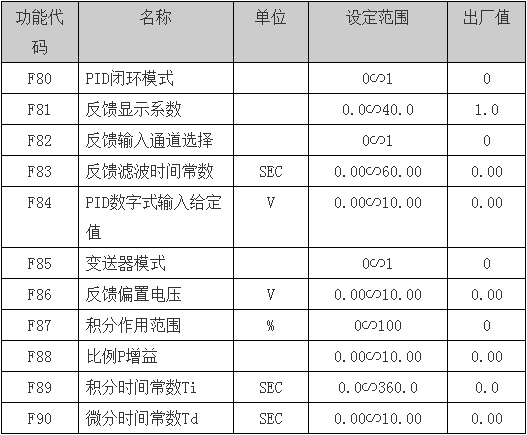 功能代碼F88∽F90為PID控制的調(diào)節(jié)參數(shù),適當修改這些參數(shù),可使閉環(huán)控制系統(tǒng)的性能最佳。
